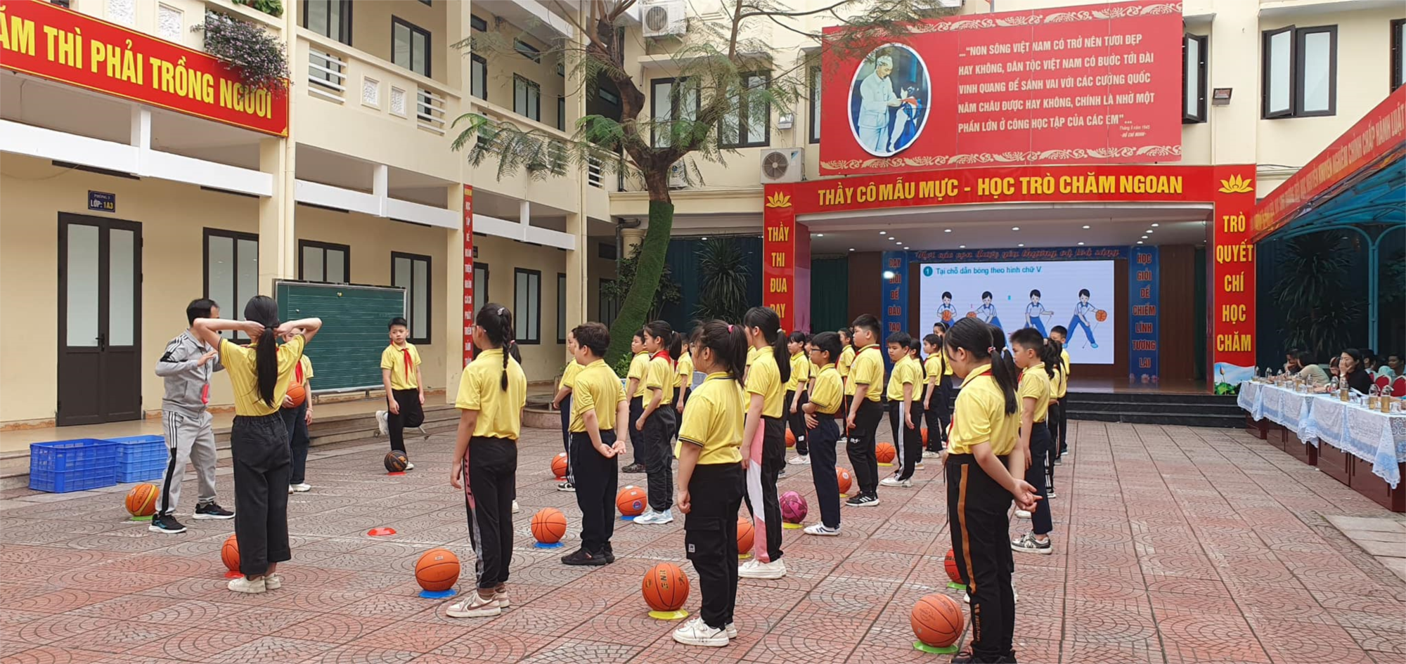 Tại buổi SHCM, mọi người được dự giờ minh họa họa tiết GDTC lớp 4 của hai trường Tiểu học Nguyễn Khuyến và Tiểu học Kim Đồng. Trường Tiểu học Nguyễn Khuyến dạy tiết 1 với bài “Các động tác làm tăng khả năng điều khiển bóng” do cô giáo Phạm Thuỳ Dịu thể hiện.