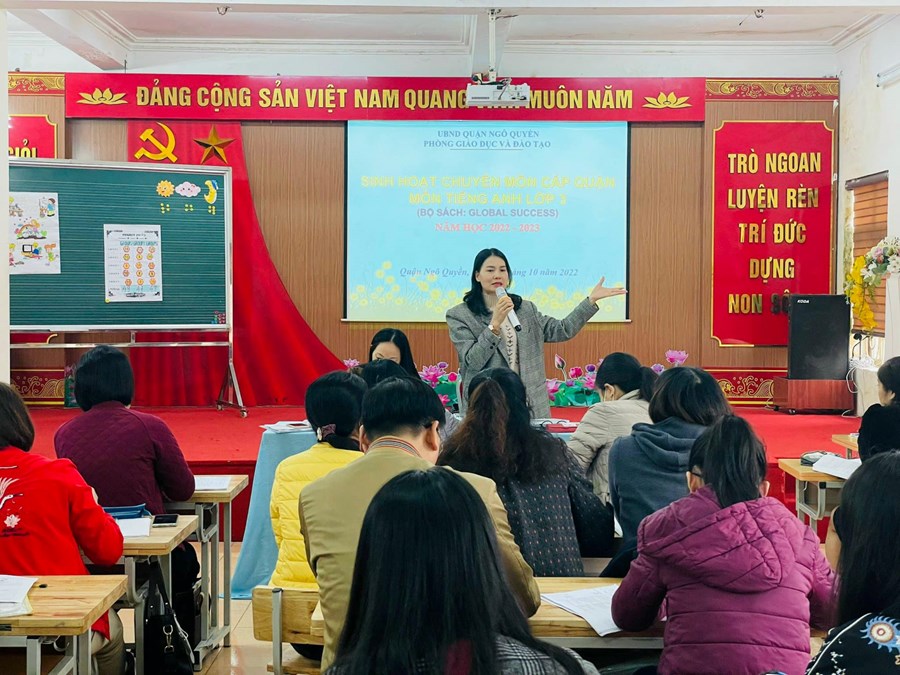 Tới dự và chỉ đạo buổi sinh hoạt chuyên đề có các đồng chí lãnh đạo, chuyên viên phòng GD&ĐT: đồng chí Nguyễn Thị Hải Hạnh - Phó trưởng phòng, phòng GD&ĐT quận Ngô Quyền; đồng chí Nguyễn Thị Thúy - Chuyên viên phòng GD&ĐT, phụ trách chuyên môn Tiếng Anh; các đồng chí trong BGH cùng toàn thể giáo viên Tiếng Anh của các trường Tểu học trong toàn Quận về dự giờ.
